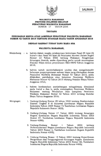 Peraturan Walikota Makassar Nomor 17 Tahun 2016 Tentang Perubahan Kedua Atas Lampiran Peraturan Walikota Makassar Nomor 42 Tahun 2015 Tentang Standar .............