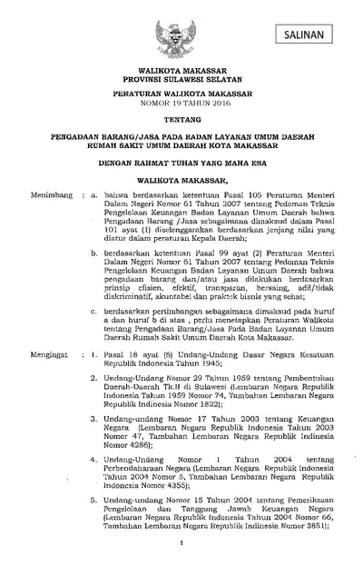 Peraturan Walikota Makassar Nomor 19 Tahun 2016 Tentang Pengadaan Barang/jasa Pada Badan Layanan Umum Daerah Rumah Sakit Umum Daerah Kota Makassar