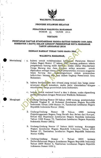 Peraturan Walikota Makassar Nomor 21 Tahun 2016 Tentang Penetapan Daftar Standarisasi Harga Satuan Barang Dan Jasa Semester I (satu) Dalam Lingkup .............