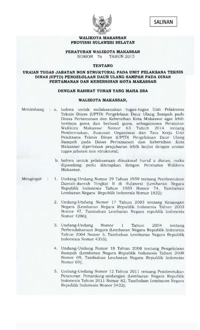Peraturan Walikota Makassar Nomor 76 Tahun 2015 Tentang Uraian Tugas Jabatan Non Struktural Pada Unit Pelaksana Teknis Dinas (UPTD) Pengelolaan Daur .............