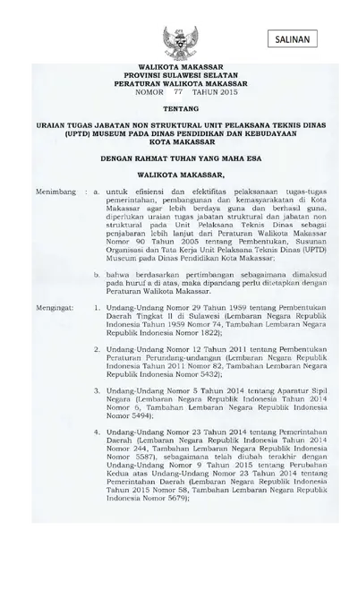 Peraturan Walikota Makassar Nomor 77 Tahun 2015 Tentang Uraian Tugas Jabatan Non Struktural Unit Pelaksana Teknis Dinas (UPTD) Museum Pada Dinas .............
