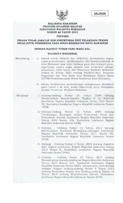 Peraturan Walikota Makassar Nomor 80 Tahun 2015 Tentang Uraian Tugas Jabatan Non Struktural Pada Unit Pelaksana Teknis Dinas (UPTD) Puskesmas Pada .............
