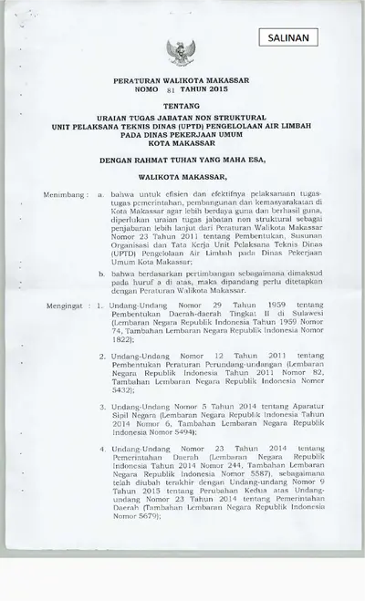 Peraturan Walikota Makassar Nomor 81 Tahun 2015 Tentang Uraian Tugas Jabatan Non Struktural Unit Pelaksana Teknis Dinas (UPTD) Pengelolaan Air Limbah .............
