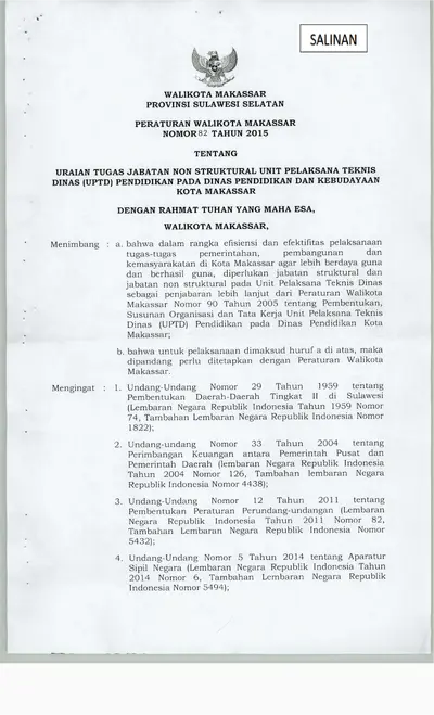 Peraturan Walikota Makassar Nomor 82 Tahun 2015 Tentang Uraian Tugas Jabatan Non Struktural Unit Pelaksana Teknis Dinas (UPTD) Pendidikan Pada Dinas .............