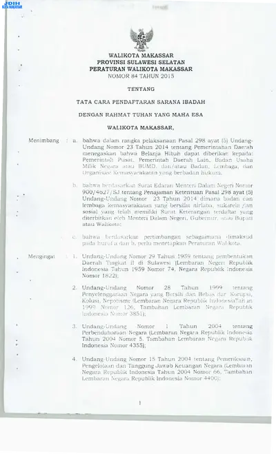 Peraturan Walikota Makassar Nomor 84 Tahun 2015 Tentang Tata Cara Pendaftaran Sarana Ibadah
