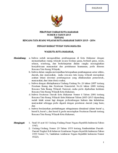 Peraturan Daerah Kota Makassar Nomor 4 Tahun 2015 Tentang Rencana Tata Ruang Wilayah Kota Makassar Tahun 2015 - 2034