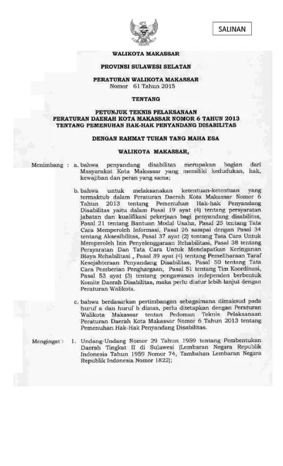 Peraturan Walikota Makassar Nomor 61 Tahun 2015 Tentang Petunjuk Teknis Pelaksanaan Peraturan Daerah Kota Makassar Nomor 6 Tahun 2013 Tentang .............
