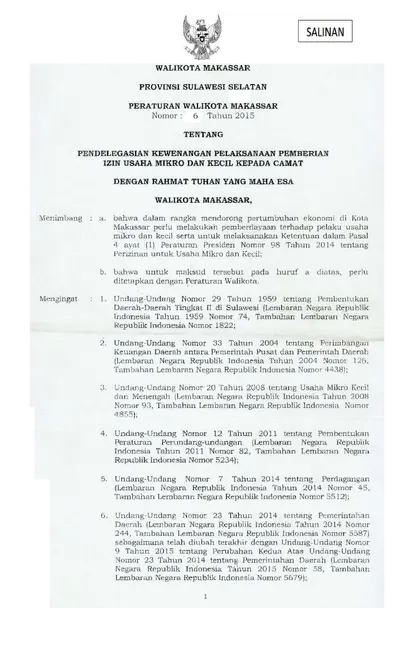 Peraturan Walikota Makassar Nomor 65 Tahun 2015 Tentang Pendelegasian Kewenangan Pelaksanaan Pemberian Izin Usaha Mikro Dan Kecil Kepada Camat