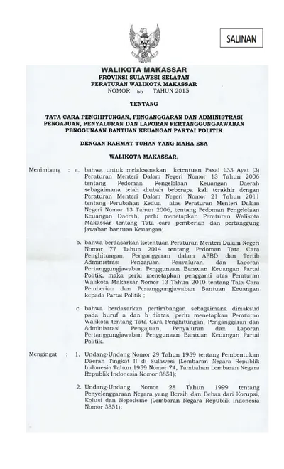 Peraturan Walikota Makassar Nomor 66 Tahun 2015 Tentang Tata Cara Penghitungan, Penganggaran Dan Administrasi Pengajuan, Penyaluran Dan Laporan .............