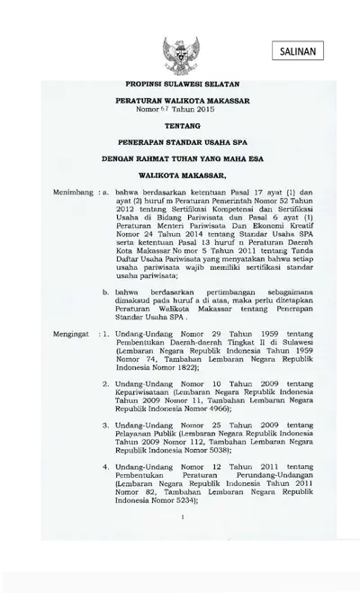 Peraturan Walikota Makassar Nomor 67 Tahun 2015 Tentang Penerapan Standar Usaha Spa