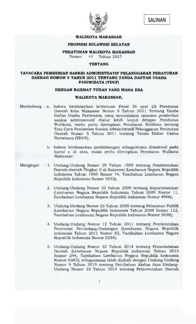 Peraturan Walikota Makassar Nomor 68 Tahun 2015 Tentang Tatacara Pemberian Sanksi Administratif Pelanggaran Peraturan Daerah Nomor 5 Tahun 2011 .............