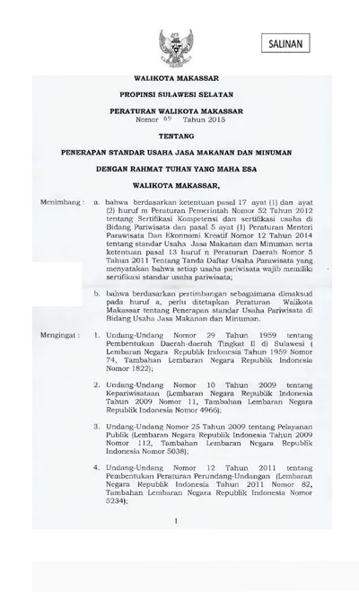 Peraturan Walikota Makassar Nomor 69 Tahun 2015 Tentang Penerapan Standar Usaha Jasa Makanan Dan Minuman