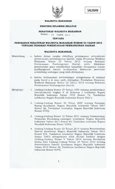 Peraturan Walikota Makassar Nomor 73 Tahun 2015 Tentang Perubahan Peraturan Walikota Makassar Nomor 53 Tahun 2012 Tentang Pedoman Perencanaan .............
