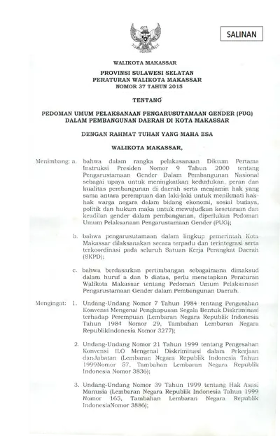 Peraturan Walikota Makassar Nomor 37 Tahun 2015 Tentang Pedoman Umum Pelaksanaan Pengarustamaan Gender (pug) Dalam Pembangunan Daerah Di Kota Makassar