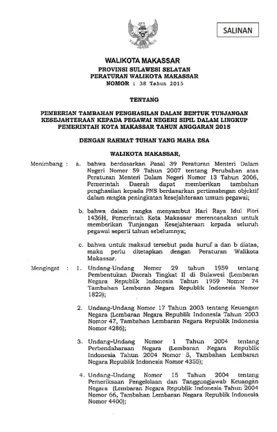Peraturan Walikota Makassar Nomor 38 Tahun 2015 Tentang Pemberian Tambahan Penghasilan Dalam Bentuk Tunjangan Kesejahteraan Kepada Pegawai Negeri .............