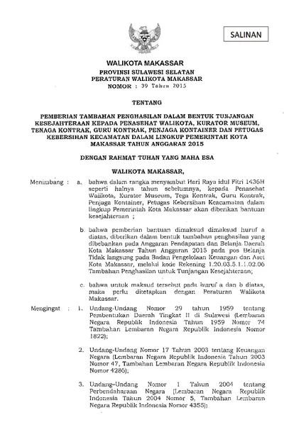 Peraturan Walikota Makassar Nomor 39 Tahun 2015 Tentang Pemberian Tambahan Penghasilan Dalam Bentuk Tunjangan Kesejahteraan Kepada Penasehat .............