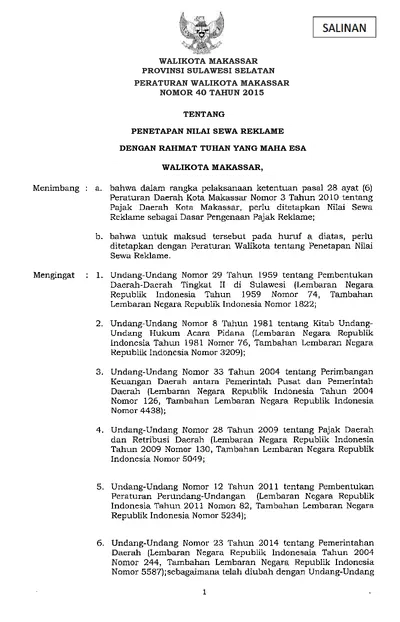 Peraturan Walikota Makassar Nomor 40 Tahun 2015 Tentang Penetapan Nilai Sewa Reklame