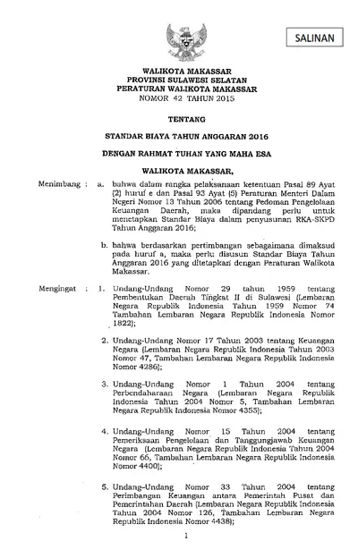 Peraturan Walikota Makassar Nomor 42 Tahun 2015 Tentang Standar Biaya Tahun Anggaran 2016