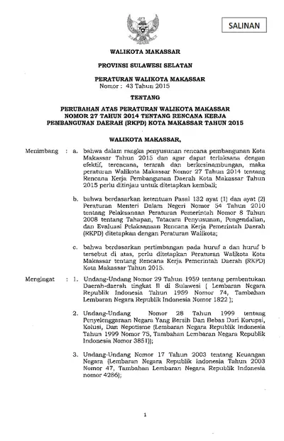 Peraturan Walikota Makassar Nomor 43 Tahun 2015 Tentang Perubahan Atas Peraturan Walikota Makassar Nomor 27 Tahun 2014 Tentang Rencana Kerja .............