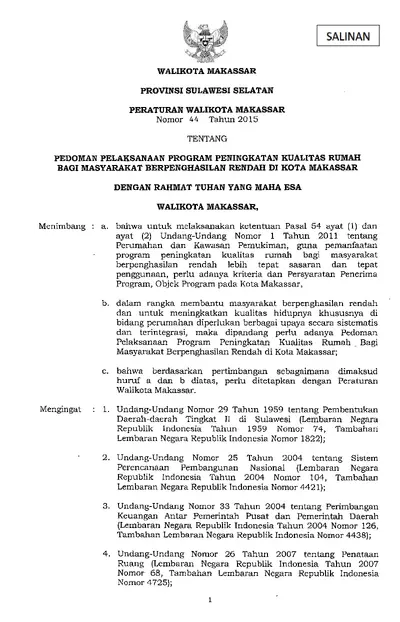 Peraturan Walikota Makassar Nomor 44 Tahun 2015 Tentang Pedoman Pelaksanaan Program Peningkatan Kualitas Rumah Bagi Masyarakat Berpenghasilan Rendah .............