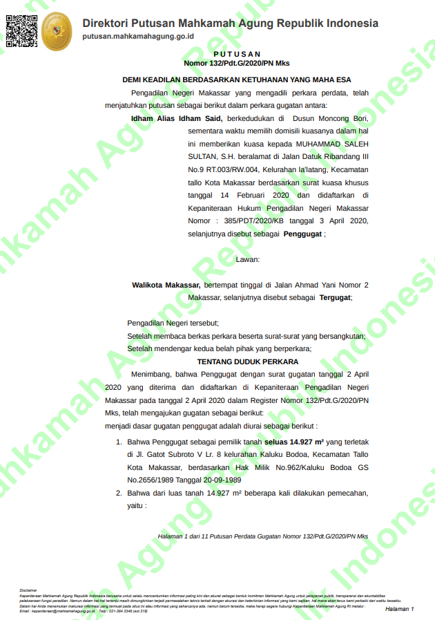 Putusan Pengadilan Negeri Makassar Nomor 132/Pdt.G/2020/PN Mks
